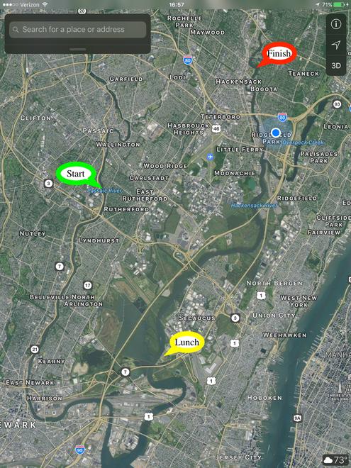 We will depart from Nereid Boat Club in Rutherford, NJ. The Passaic River will lead us past Lyndhurst, Nutley, North Arlington, Belleville, Kearny, Newark, Harrison, into Newark Bay. Rowing around Kearny Point we will enter the Hackensack River past Jersey City. In Secaucus, at Laurel Hill County Park we will have a one-hour lunch break. Then we will continue through the Meadowlands past North Bergen, Carlstadt, Moonachie, Little Ferry, Ridgefield Park, and Bogota. Our final destination will be Foschini Park in Hackensack. The total distance is 27 miles (43.5 km).
